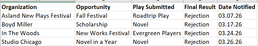 And pretty different from the March of last year! Last year I received 7 rejections in March, all of them from playwriting opportunities. This year’s rejections consist of two rejections from specific novel writing opportunities. I’m not querying my novel at this time, the rejections are from two opportunities that would have provided some support towards the goal of refining my YA novel and finishing my adult novel – a bummer to not receive support, but onwards I go! Don’t worry, when I do begin the querying process there will be so many rejections, our eyes will blur! Working towards that day.